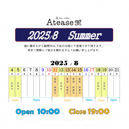 夏季休業のご案内 【8/11(月)~8/15(金) 】は休業させて頂きます。