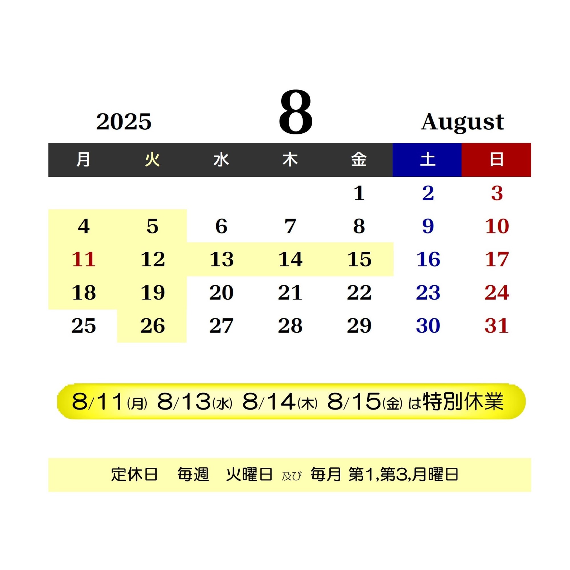 8/18(月)8/19(火)の定休日と