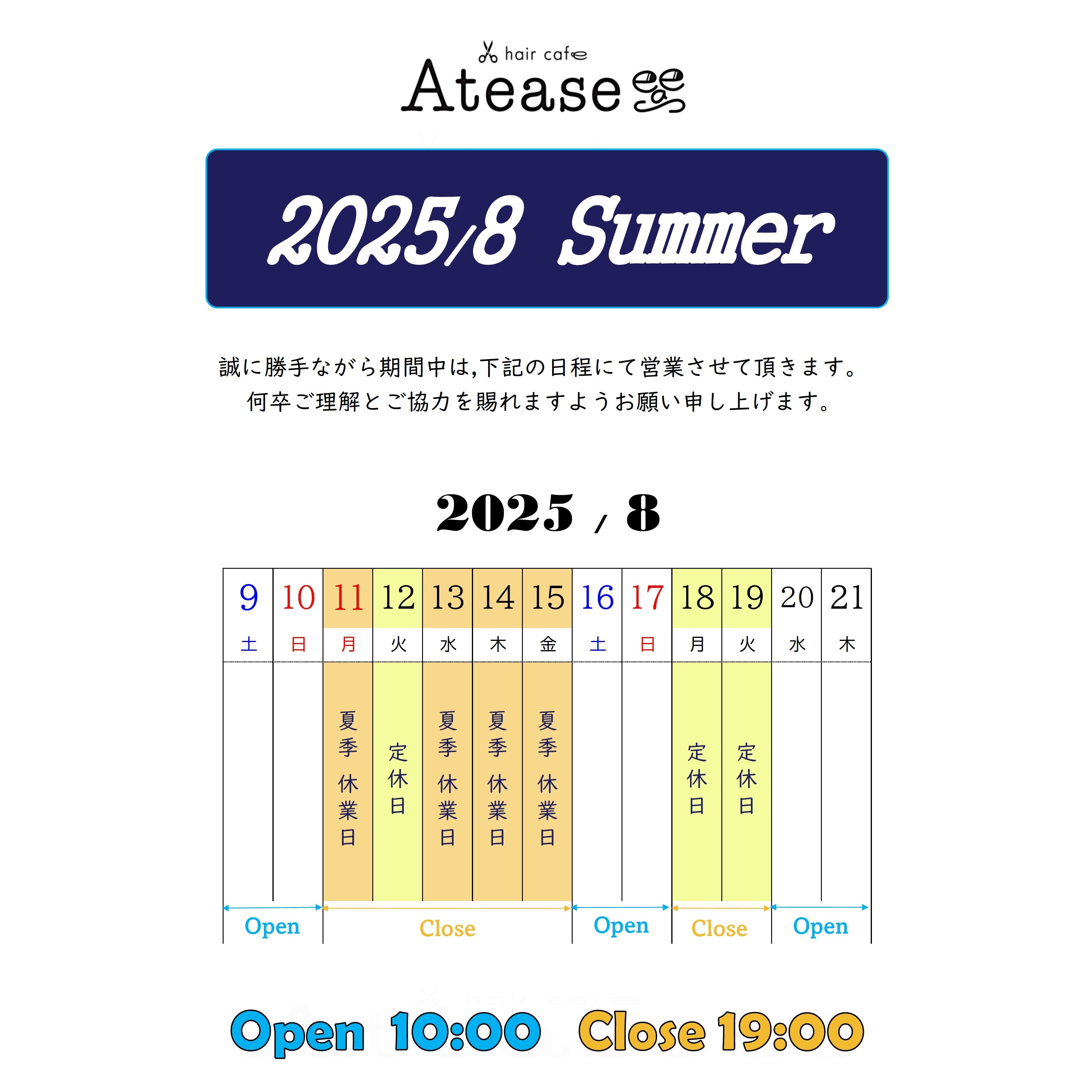 8/11(月)~8/15(金) 及び 8/18(月)8/19(火) は休業致します