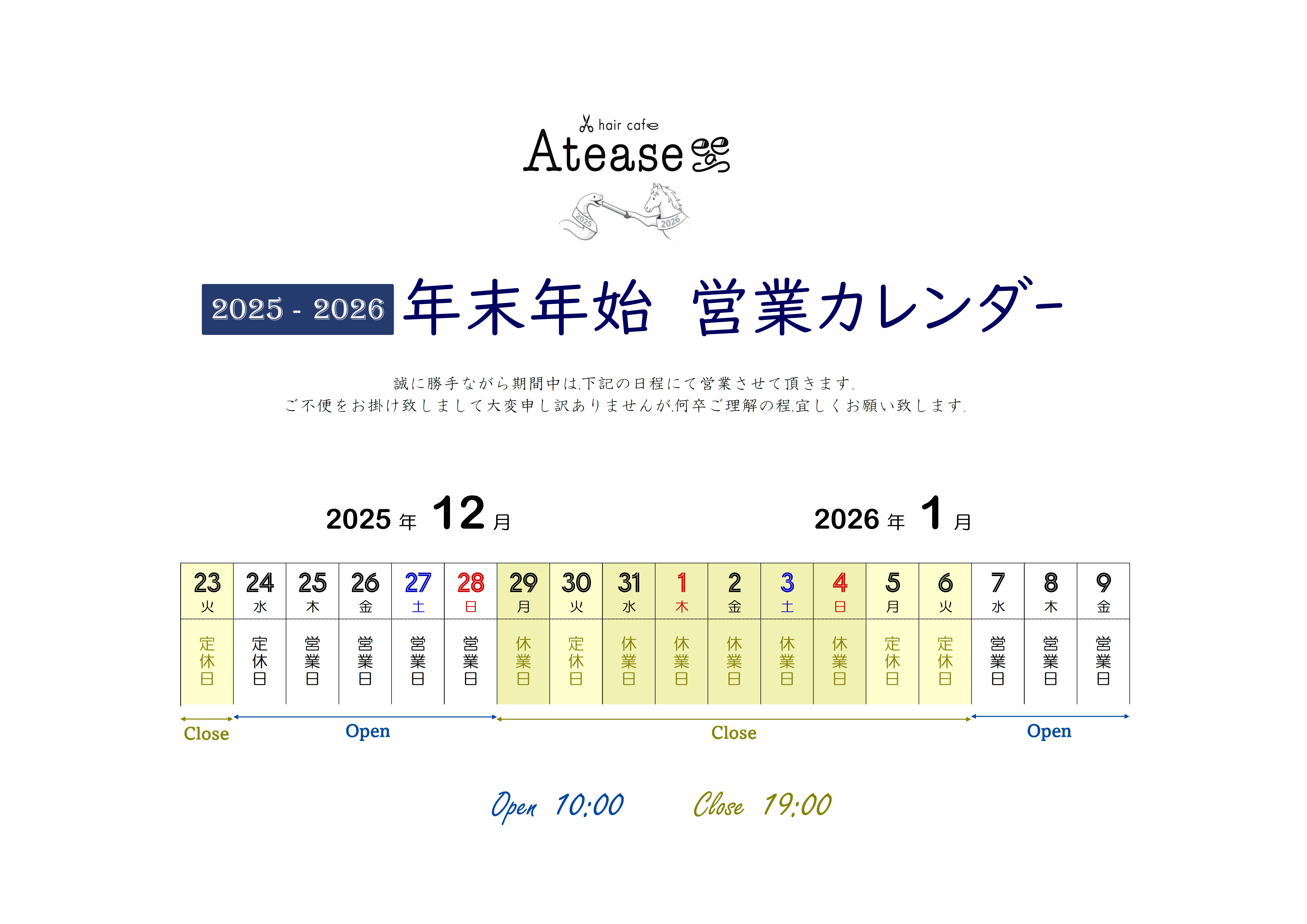 明日2025/12/29(月)~2026/1/6(火)の間は休業させて頂きます。